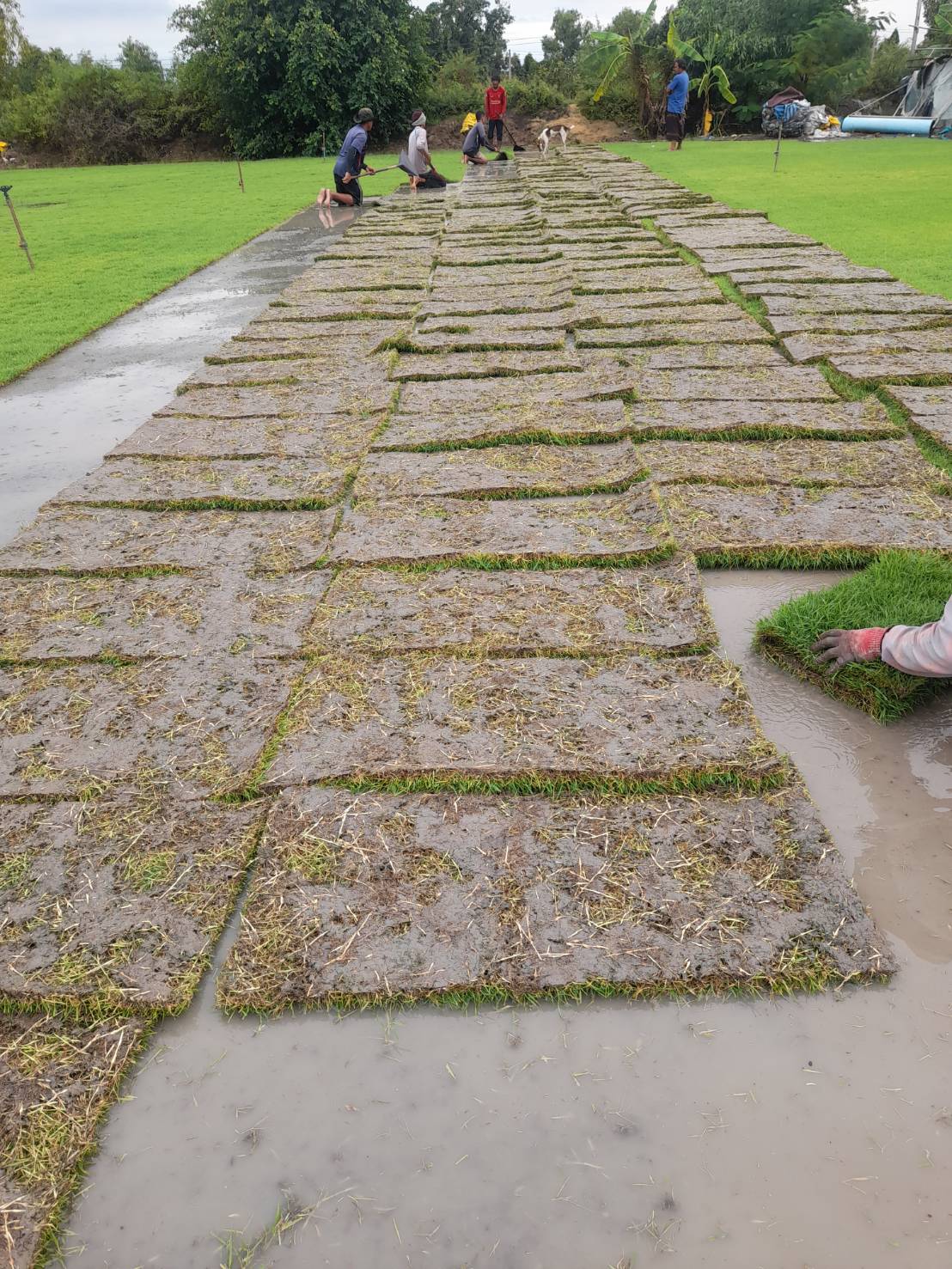 - นำลูกกลิ้งมาบดทับบนหญ้าเพื่อทำให้หญ้าเรียบเสมอเท่าๆ กันบนหญ้าที่เราจำหน่าย