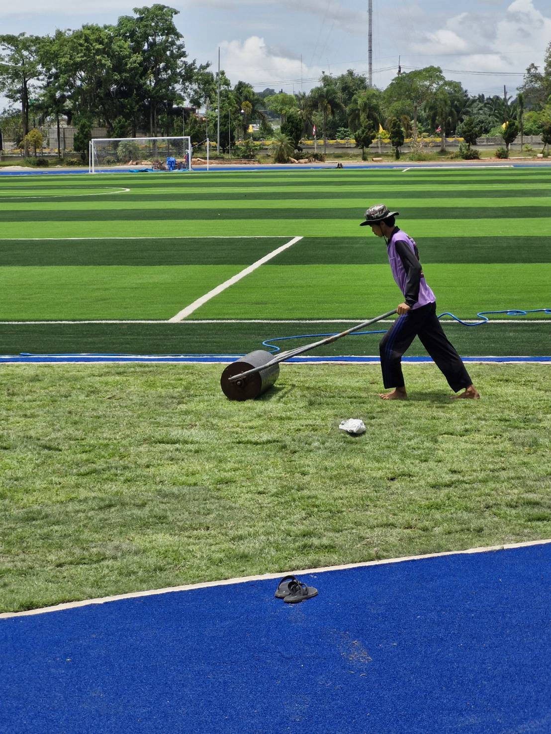 - ปูวัสดุรองพื้นป้องกันความชื้นและช่วยให้หญ้าเทียมตั้งตัวได้ดี