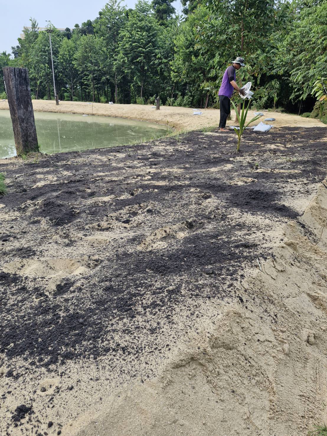 - นำดินปุ๋ยมาว่านให้ทั่วบริเวณที่จะปูหญ้า